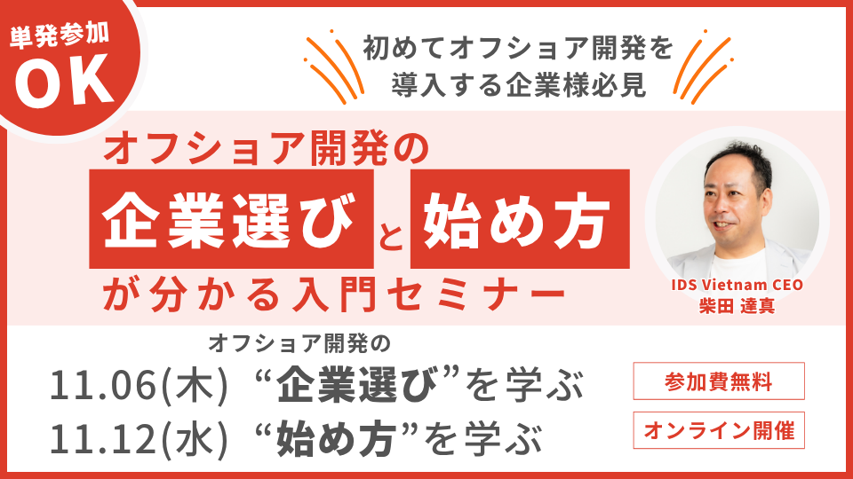 日本企業向けに特化したベトナムオフショア開発サービスを提供している「スマラボ」を運営する株式会社アイディーエス(本社:東京都港区 代表取締役:中野貴志、以下アイディーエス)は、11月12日(水)に無料セミナー「オフショア開発の"企業選び"と"始め方"が分かる入門セミナー」を開催いたします。